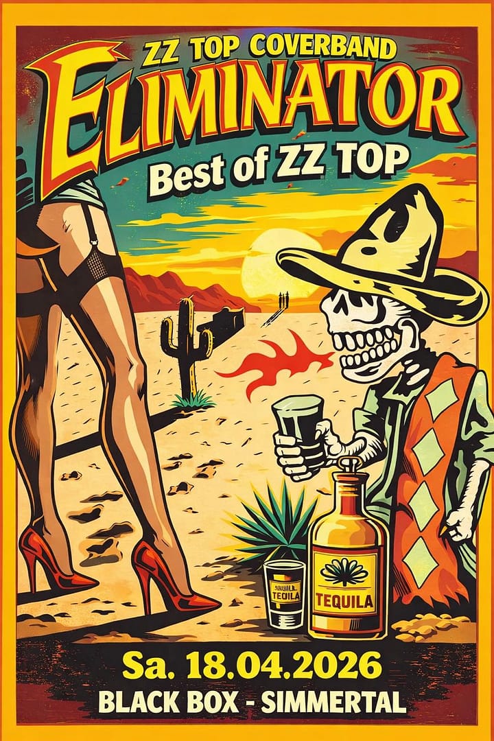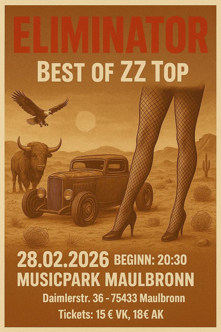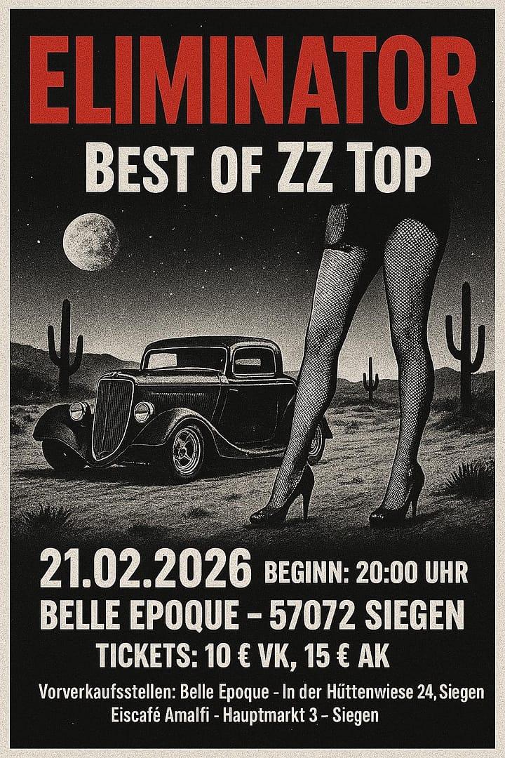 ELIMINATOR hat sich ganz dem rauhen Shuffle-Blues- Rock von ZZ Top verschrieben und spielt natürlich alle Hits wie La grange, Tush, Gimme all your lovin’, Sharp dressed man und Cheap sunglasses. Zum Programm gehören mit Arrested for driving while blind, Just got paid, Francine und Beer drinkers & hell raisers aber auch eine Reihe von ZZ Top Perlen der frühen Jahre.